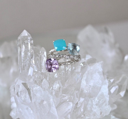 この酷暑を忘れてしまうような、涼やかで爽やかな色合いの宝石のリングや