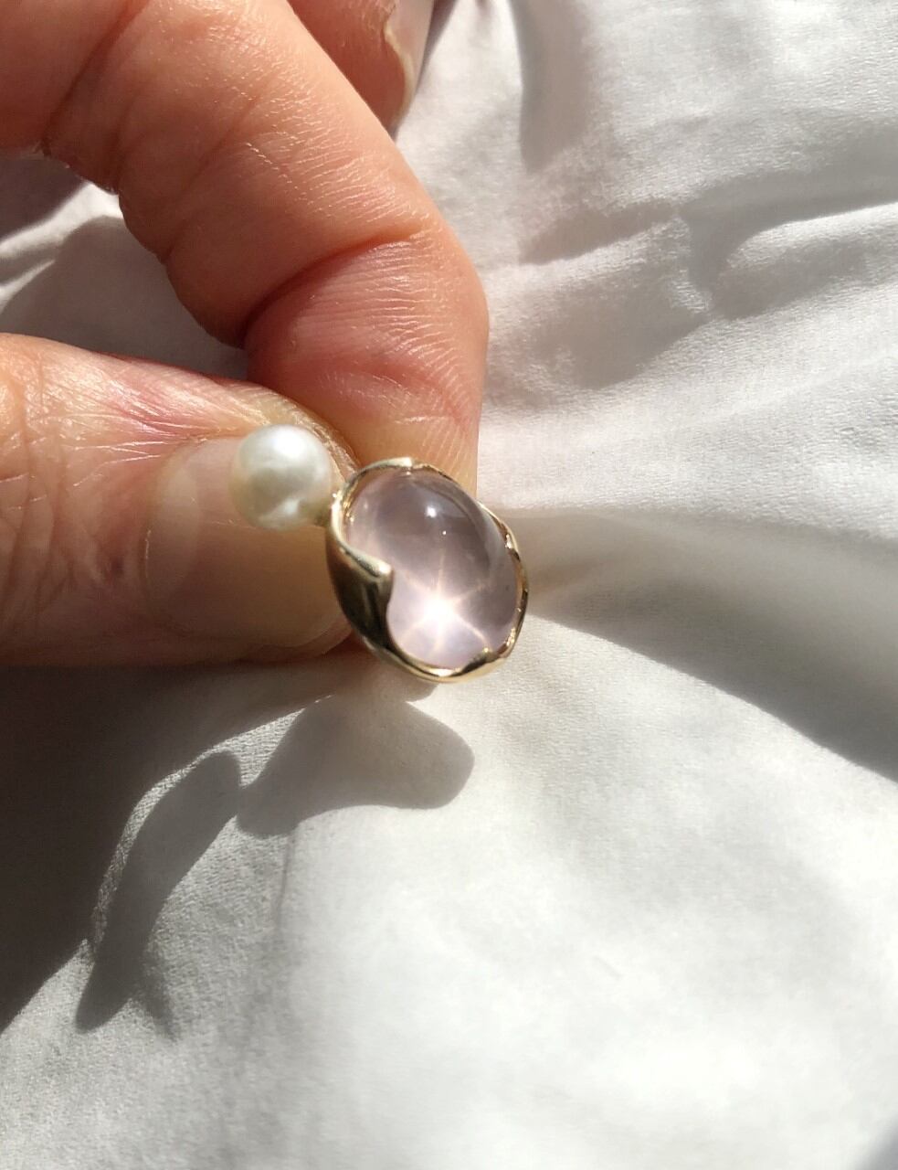 優しい色合いのローズクオーツのコロンとしたフォルムの石座