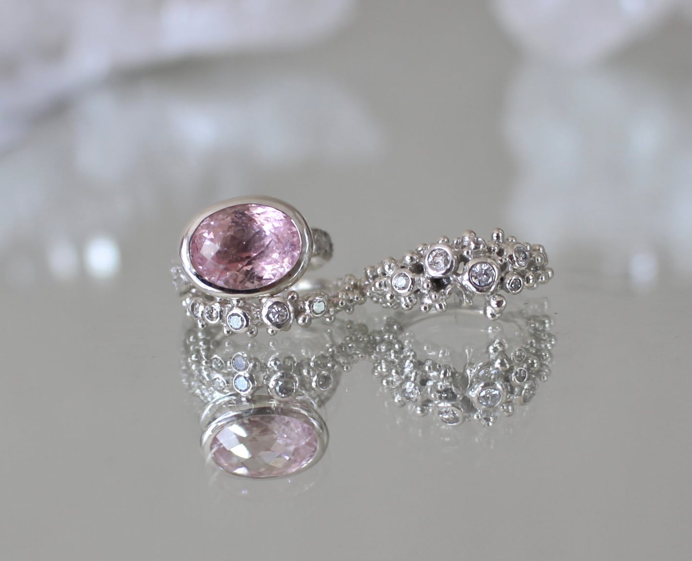 こちらの方はプラチナシルバーのクールな輝きで甘すぎず石そのものの色合いを