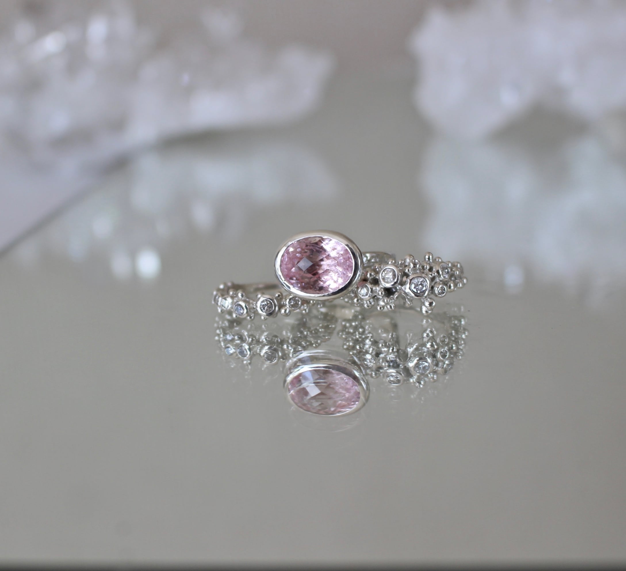 愛らしいピンク色のモルガナイトをチェッカーカットにし、光がキラキラと反射して